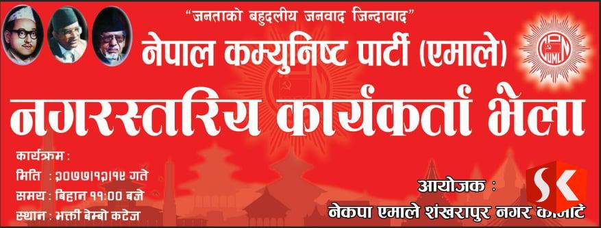 नेकपा( एमाले) शंखरापुर नगर कमिटिको आयोजनामा यहि चैत्र १९ गते बिहान ११ बजे कार्यकर्ता भेला गर्न लागिएको नेकपा (एमाले)शंखरापुर नगर कमिटिका अध्यक्ष शंकरमान श्रेष्ठले बताउनुभएको छ| तत्कालिन नेकपा एमालेको नगर अधिवेशनबाट अध्यक्षमा शंकरमान श्रेष्ठ, उपाध्यक्षमा सुधा सुबेदी,सचिवमा सुमन श्रेष्ठ तथा उपसचिवमा रबिन श्रेष्ठ लगायतका पदाधिकारी निर्वाचित भएका थिए|