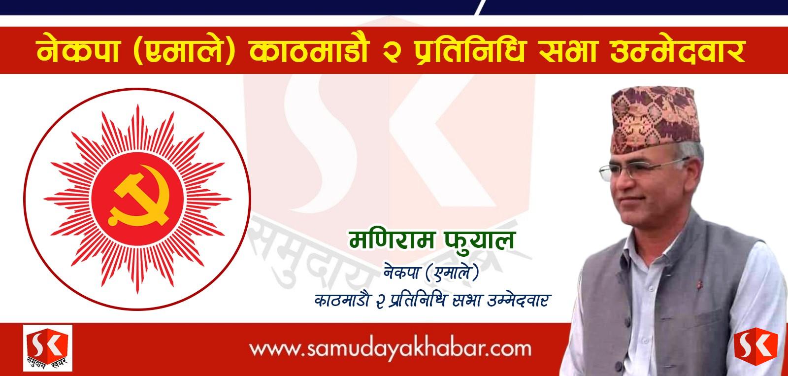 मंसिर ४ गते हुन गईरहेको प्रतिनिधिसभा निर्वाचनका लागी नेकपा एमालेका तर्फबाट उम्मेदवारमा मणिराम फुँयाल सिफारिस भएका छन्।नेकपा एमाले बागमति प्रदेश कमिटी सदस्य फुँयाल २०७४ सालमा काठमाडौं निर्वाचन क्षेत्र नं २,प्रदेश (ख) मा नेकपा एमालेका तर्फबाट निर्वाचित भएका थिए।हिजो सम्पन्न नेकपा एमालेको क्षेत्रीय कमिटीको बैठकबाट फुयालको नाम सर्वसम्मत रुपमा चयन गरीएको नेकपा एमाले शंखरापुर नगर कमिटी उपाध्यक्ष नवराज दाहालले बताए।