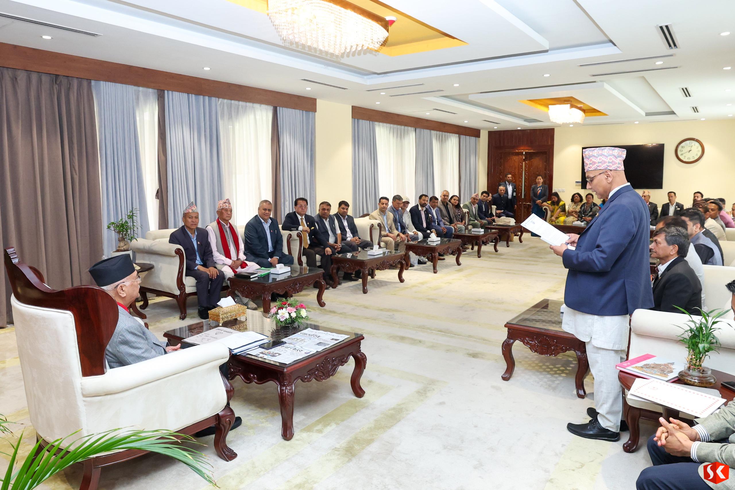 महासङ्घका नवनिर्वाचित अध्यक्ष गोविन्दप्रसाद घिमिरे नेतृत्वको टोलीले प्रधानमन्त्री निवास, बालुुवाटारमा आज प्रधानमन्त्री ओलीलाई सात बुँदे सुुझावपत्र बुुझाएको हो । महासङ्घले अर्थतन्त्र ओरालो लागेका बेला आगामी आर्थिक वर्षको नेपाल सरकारको बजेटमा आर्थिक वृद्धि र निर्यात व्यवसायलाई प्राथमिकता दिने रणनीतिहरु कार्यान्वयनका लागि आग्रह गर्दै सम्बोधन हुन छुुट भएका विषयमा ध्यानाकर्षण गराएको छ ।