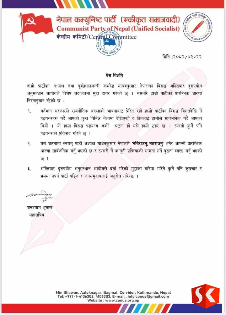 काठमाडौं । नेकपा (एकीकृत समाजवादी) ले अध्यक्ष माधव कुमार नेपालविरुद्ध दायर मुद्दालाई योजनाबद्ध राजनीतिक चालको रूपमा लिँदै सत्यको पक्षमा दृढ भएर अगाडि बढ्ने प्रतिबद्धता जनाएको छ।