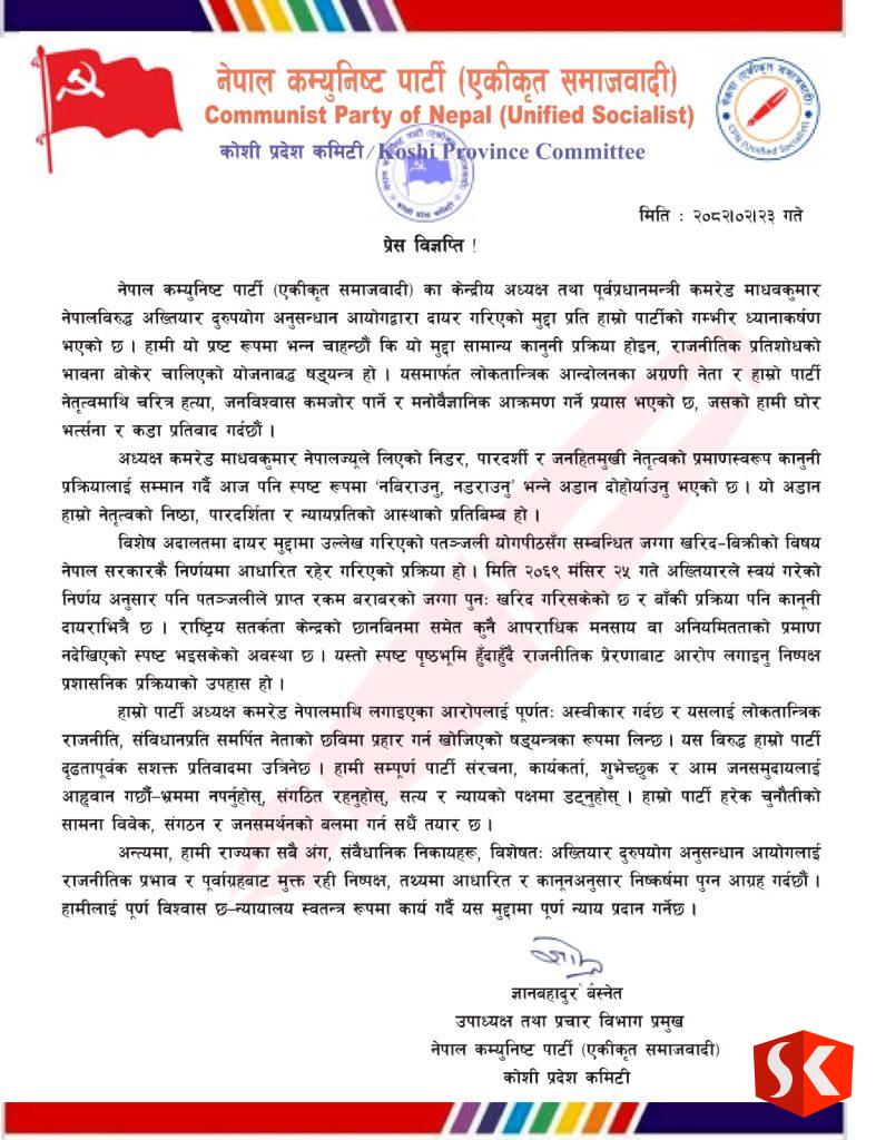 विज्ञप्तिमा अगाडि भनिएको छ,ुअध्यक्ष तथा पूर्वप्रधानमन्त्री कमरेड माधवकुमार नेपालविरुद्ध अख्तियार दुरुपयोग अनुसन्धान आयोगद्वारा दायर गरिएको मुद्दा प्रति हाम्रो पार्टीको गम्भीर ध्यानाकर्षण भएको छ। हामी यो स्पष्ट रुपमा भन्न चाहन्छौं कि यो मुद्दा सामान्य कानुनी प्रक्रिया होइन, राजनीतिक प्रतिशोधको भावना बोकेर चालिएको योजनावध्द सड्यन्त्र हो। यस मार्फत लोकतान्त्रिक आन्दोलनका अग्रणी नेता र हाम्रो पार्टी नेतृत्वमाथि चरित्र हत्या,जनविश्वास कम्जोर पार्ने र मनोबैज्ञानिक आक्रमण गर्ने प्रयास भएको छ ,जस्को हामी घोर भत्सना र प्रतिवाद गर्दछौं ।