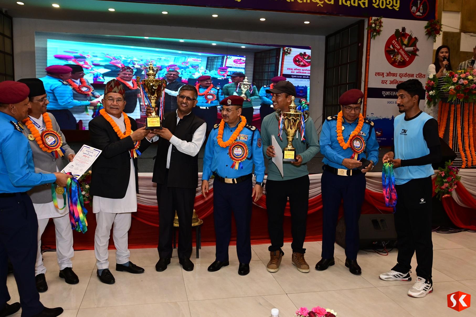 ललितपुर महानगरपालिकाका प्रमुख महर्जन, प्रहरी महानिरीक्षक थापा, प्रहरी अतिरिक्त महानिरीक्षक तामाङ र ललितपुर जिल्लाका प्रमुख जिल्ला अधिकारी रमेश ढकालले लागूऔषध दुरूपयोग एवम् ओसारपसार विरूद्ध अन्तर्राष्ट्रिय दिवसको अवसरमा आयोजित अन्तर विद्यालय स्तरीय फुटसल प्रतियोगिताका विजेताहरूलाई पुरस्कार प्रदान गर्नुभयो ।
