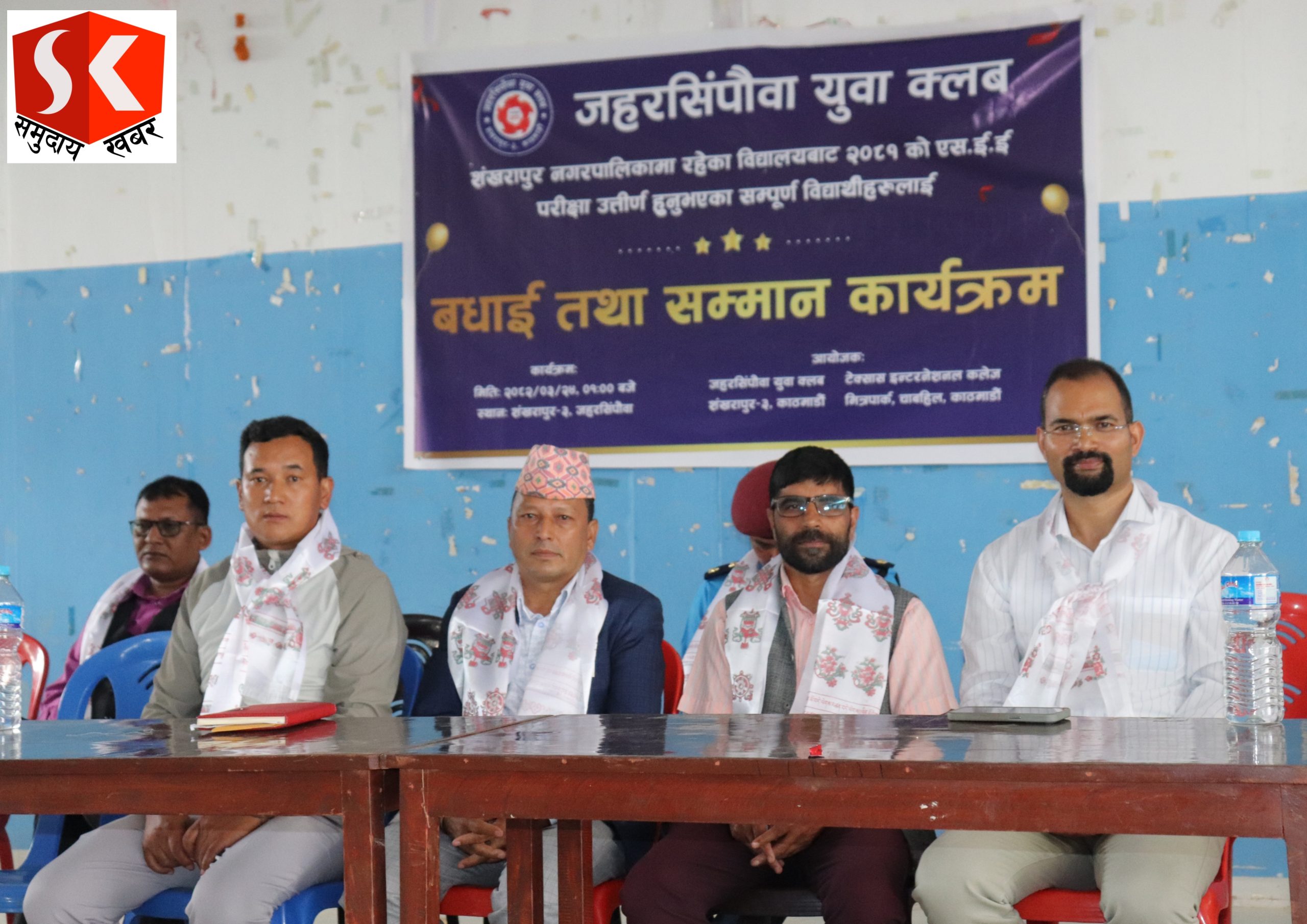 उक्त कार्यक्रमको प्रमुख अतिथिको रुपमा शंखरापुर नगरपालिका मेयर रमेश नापित तथा उपमेयर समिता श्रेष्ठ र वडा नं १ का अध्यक्ष बाबुराम दंगाल तथा वडा नं ३ का अध्यक्ष सुर्य बहादुर तामाङ लगायत सहभागी थिए।मित्रपार्क स्थित टेक्सास ईन्टरनेशनल कलेजको आर्थिक सहयोगमा सम्पन्न उक्त कार्यक्रमा उक्त कलेजका प्रबन्ध निर्देशक जितेन कुमार बाखु तथा वित्तीय निर्देशक कृष्ण प्रसाद दंगालको समेत उपस्थिती थियो।उक्त कार्यक्रममा शंखरापुर नगरपालिकाबाट उत्कृष्ट ग्रेड प्राप्त गर्ने दुई जना बिद्यार्थीलाई ७-७ हजार नगद सहित सम्मान गरिएको थियो।उक्त कार्यक्रम जहरसिंपौवा युवा क्लबका अध्यक्ष बासु तामाङको अध्यक्षतामा भएको थियो भने कार्यक्रम संचालन उक्त क्लबका सल्लाहकार किशोर घ्लानले गरेका थिए।यस बर्ष शंखरापुर नगरपालिकाबाट २ वटा सामुदायिक बिद्यालयहरु भगवती मा.बि. ४:०० जिपिए सहित उत्कृष्ट र वडा नं ९ को रास्ट्रीय माबी १०० प्रतिशत उतिर्ण गर्न सफल भएका थिए।