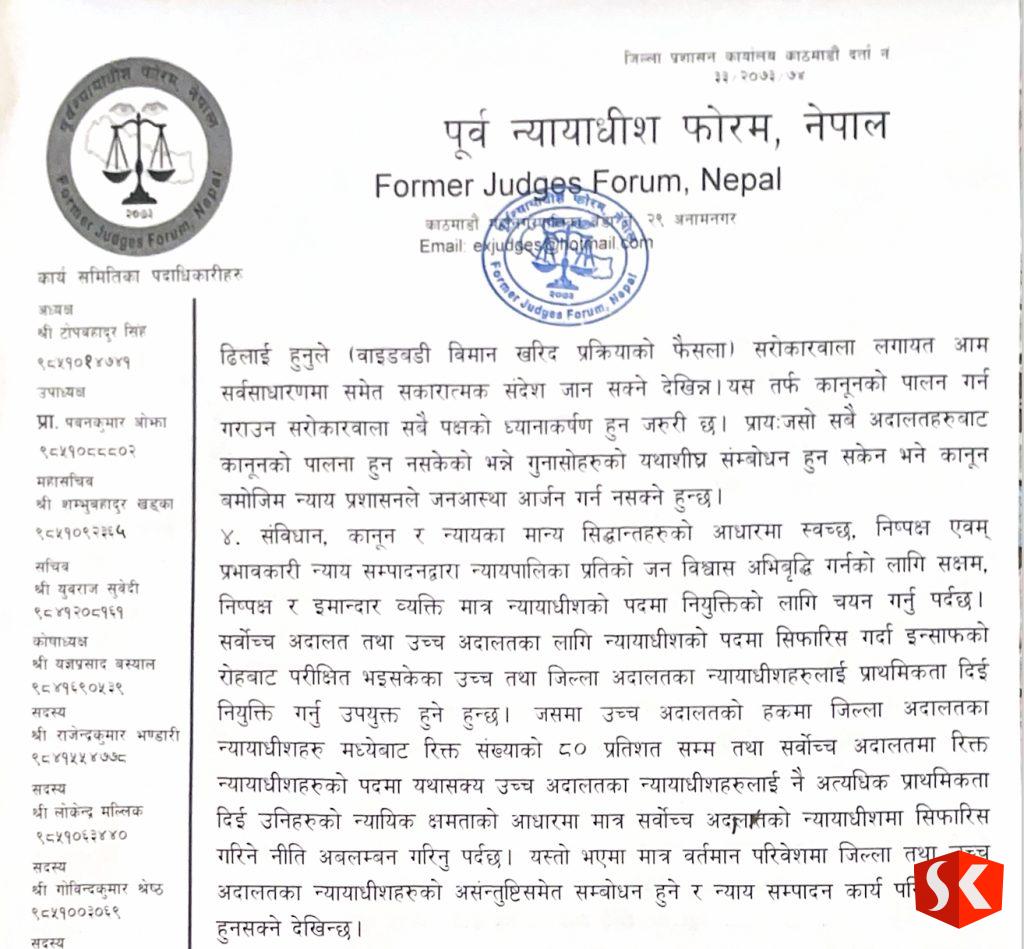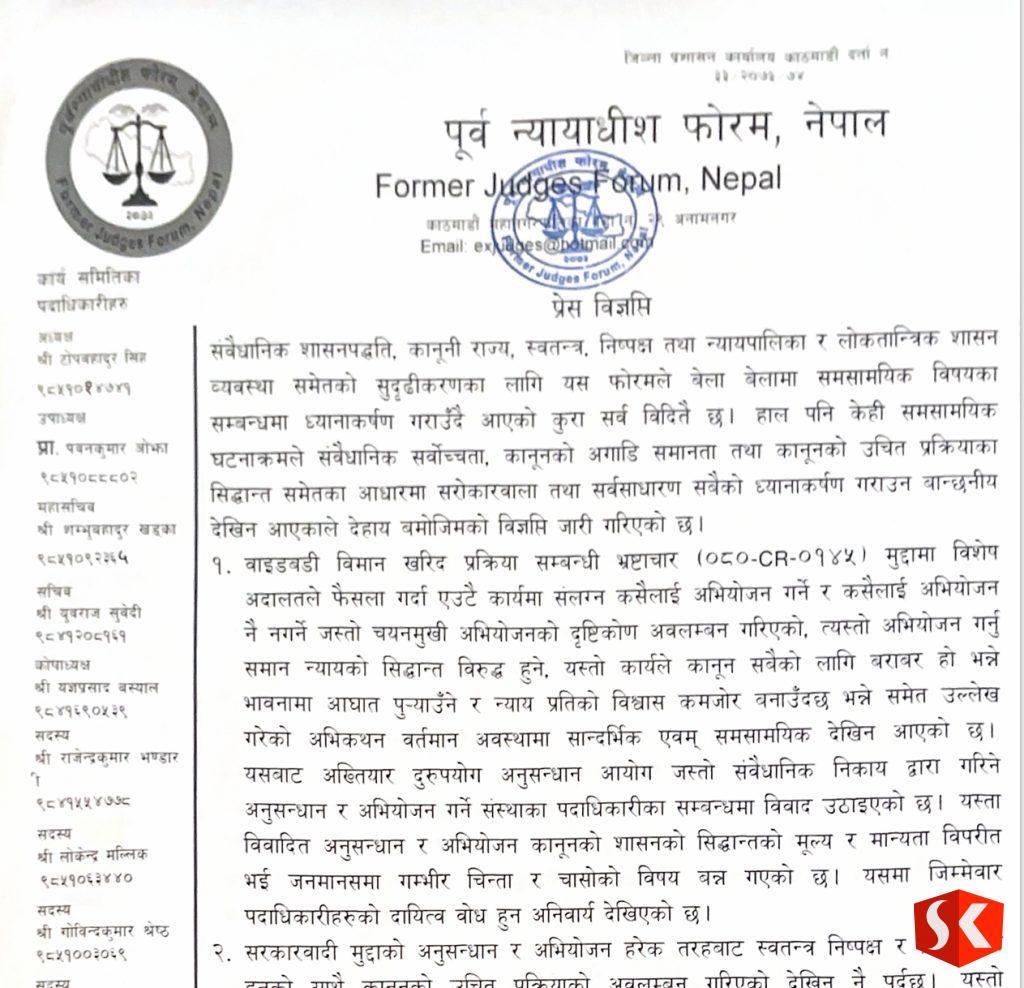 काठमाडौँ ।अख्तियार दुरुपयोग अनुसन्धान आयोगले वाइडबढी विमान खरिद प्रक्रियासम्बन्धी भ्रष्टाचार मुद्दामा अख्तियारले गरेको अभियोजनमा पूर्वन्यायाधीश फोरमले आपत्ति जनाएको छ। बिहीवार फोरमले एक विज्ञप्ति जारी गर्दै आपत्ति जनाएको हो।